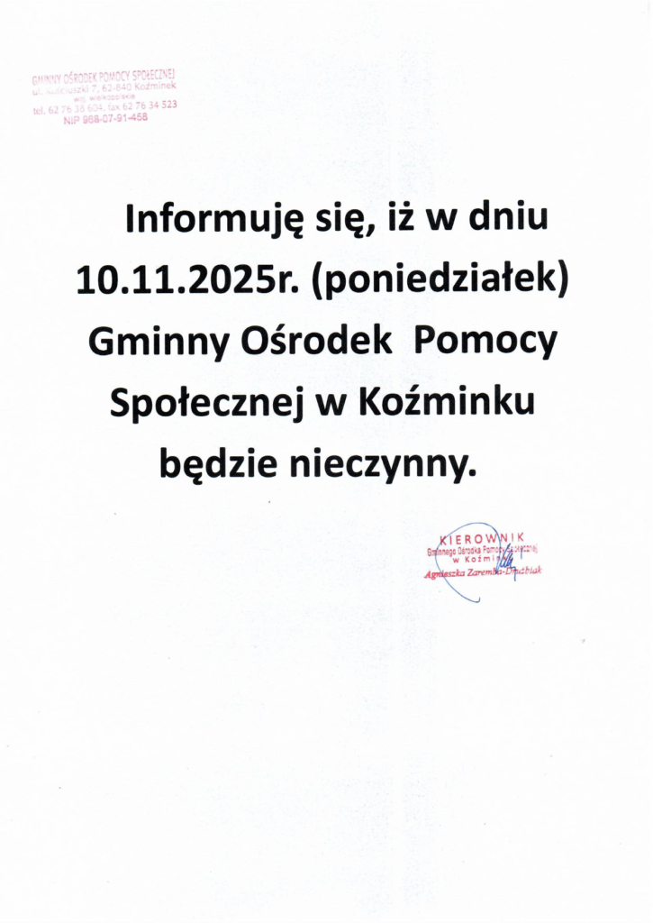 Uprzejmie informujemy, że w dniu 10 listopada 2025r. Gminny Ośrodek Pomocy Społecznej w Koźminku będzie nieczynny. 6 listopada 2025 Dzień wolny od pracy ustalony został w zamian za święto przypadające w sobotę, tj. 1 listopada 2025r. Za wszelkie utrudnienia przepraszamy.